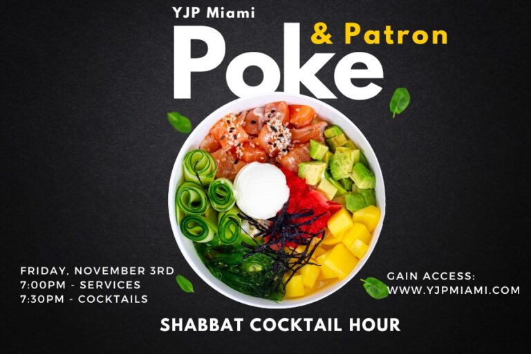 Join us for a YJP’s Rooftop Poke & Patron Cocktail Hour Friday, October 3rd 7:00pm Services7:30pm Poke & Patron Rok Family Shul – YJP Miami HeadquartersCove Rooftop35 SE 9th StreetMiami,…