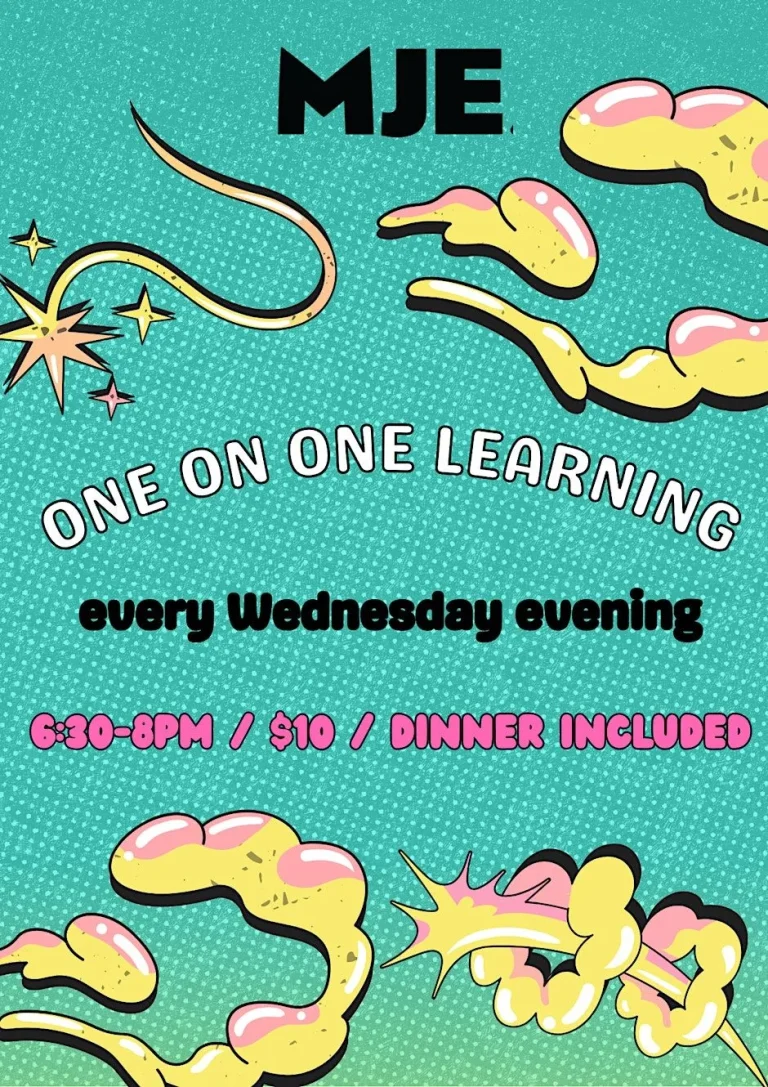 Weekly one-on-one conversations on Judaism, every student is paired with a teacher together dinner every Wednesday evenings.
