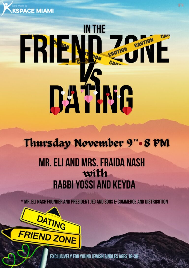 In the Friendzone VS. DatingThursday, November 9â‹…8:00 – 10:00pmMr. Eli and Mrs. Fraida Nash with Rabbi Yossi and Keyda * Eli Nash Founder and President JEG and SONS E-COMMERCE and…