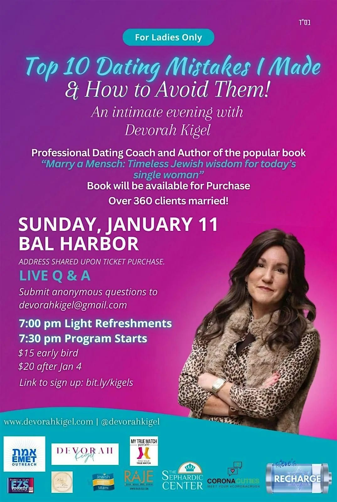 A special evening with Devorah Kigel, professional dating coach & author Jan 11 A special evening with Devorah Kigel, professional dating coach & author 7:00 pm - 9:00 pm