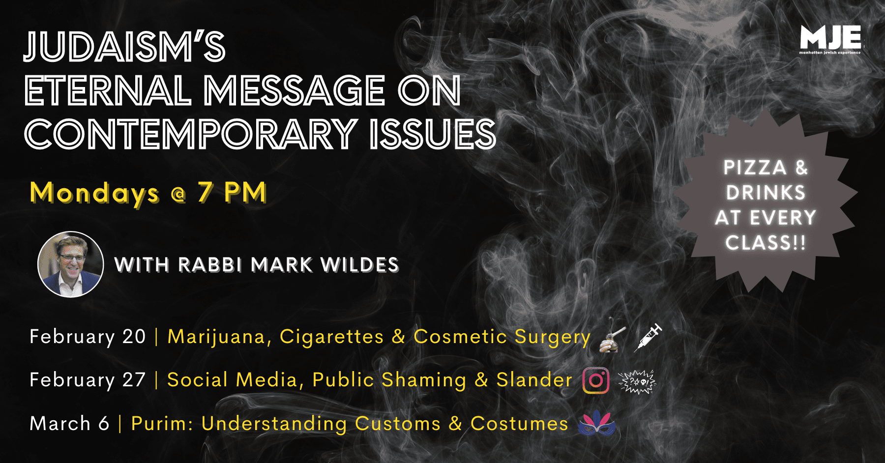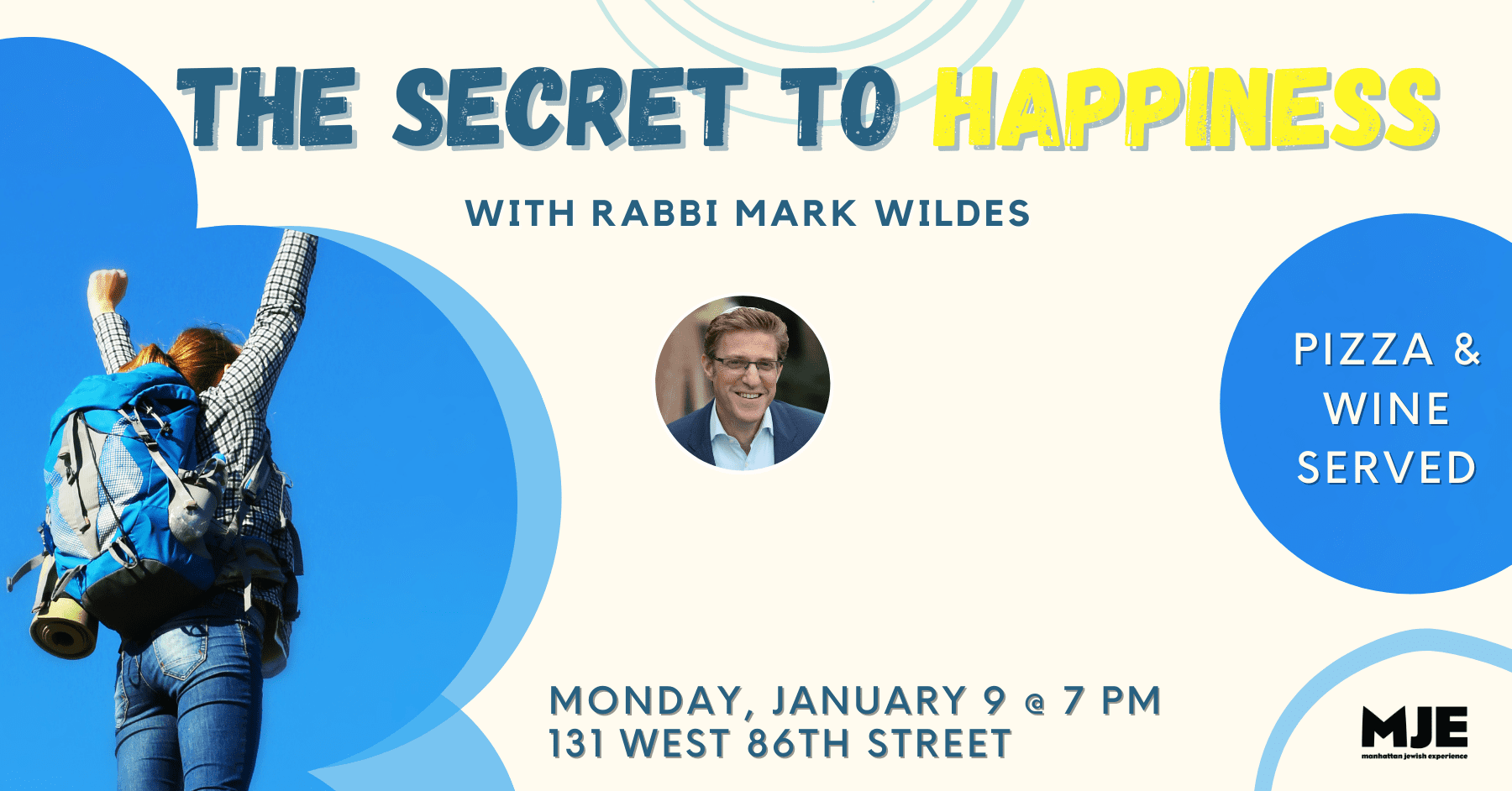 Manhattan Jewish Experience (MJE) 131 West 86th Street, New York, NY, United StatesThe Secret To Happiness | January 6If we are all looking for happiness, then why does it seem to be so rare these days and seemingly out of our grasp? Join Rabbi Mark Wildes for a powerful and enlightening class on the Torah’s path to “happiness” and how we can apply it to live a...
