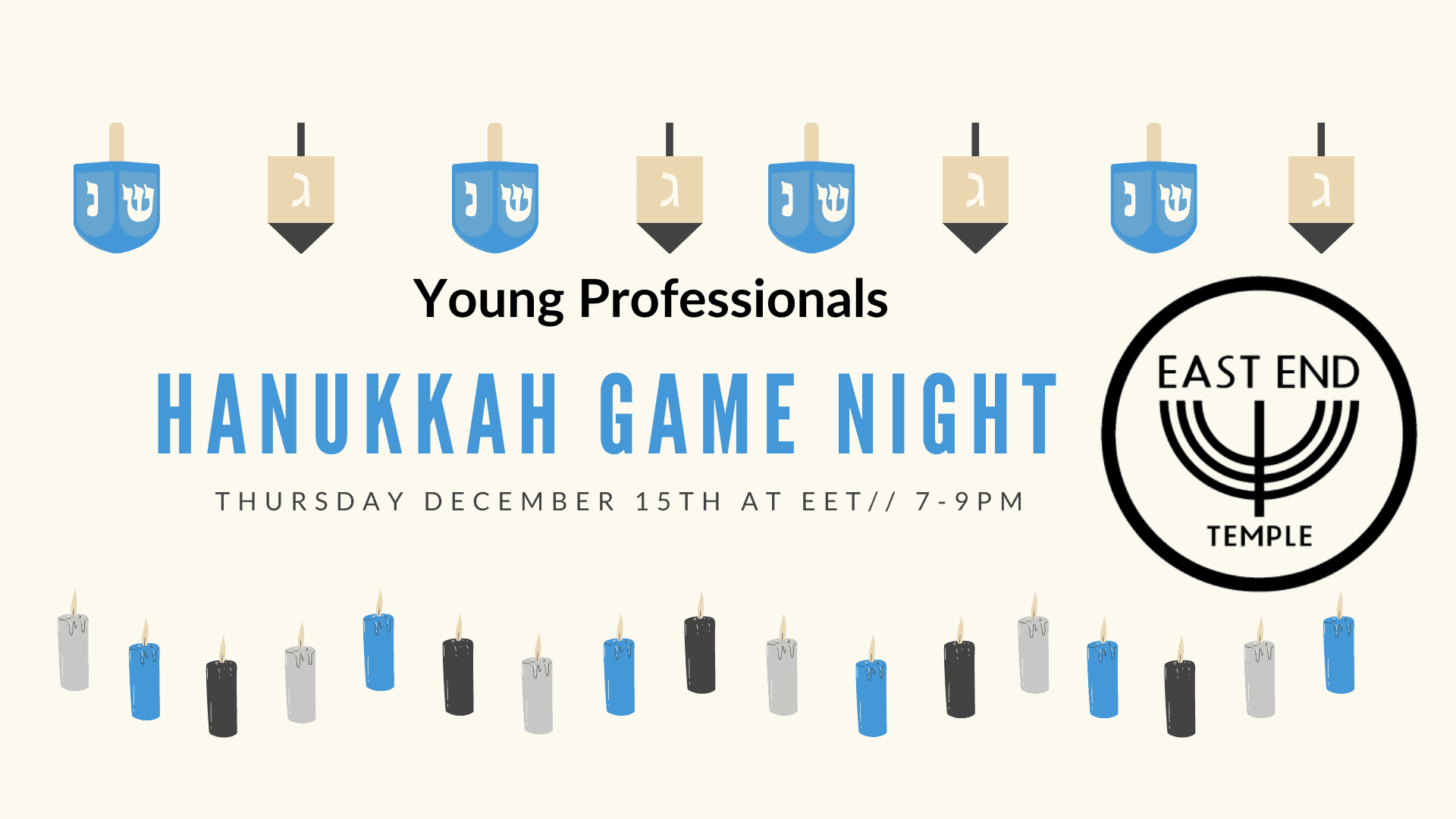 Play Dreidel and Eat Latkes with EET Young Professionals!Are you a 21-40 year old looking to connect with other young professionals in the city and build a Jewish community? We have the group for you! We are a group at East End Temple creating monthly fun social activities to connect young professionals. You are invited...