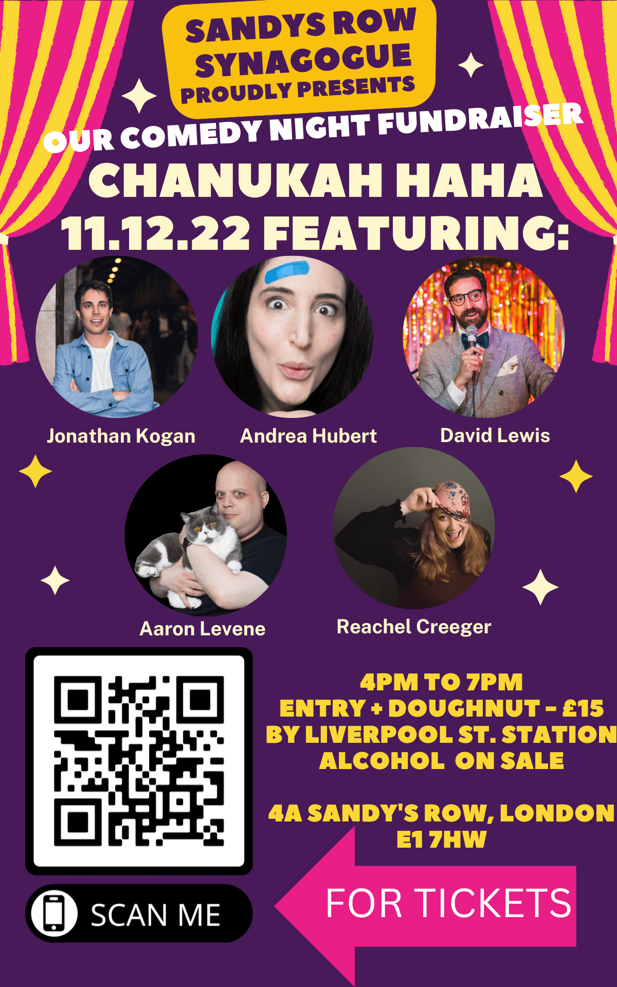 HANUKKAH-HA-HA AT SANDY'S ROW! A comedy night fundraiser for Sandy's Row synagogue! Join us for incredible Comedy, Doughnuts & drinksHANUKKAH-HA-HA AT SANDY'S ROW! A comedy night fundraiser for Sandy's Row synagogue!On the eve of the Jewish festival of light, join us for a night of jokes, laughs....and doughnuts at London's oldest Ashkenazi synagogue in a...