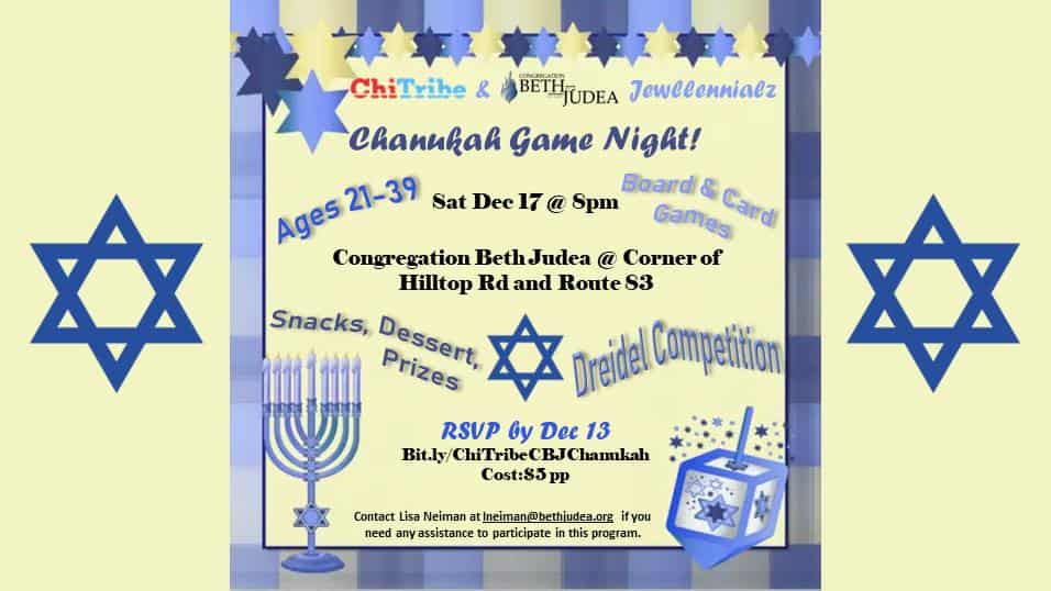 Join ChiTribe and Jewllennialz in the burbs for Hannukah party on December 17 at 8pm at Congregation Beth Judea in Long Grove. RSVP 12/13!https://www.eventbrite.com/e/suburban-hannukah-20s-30s-party-tickets-450563697147Ages 21-39Snacks, Desserts, PrizesDreidel CompetitionBoard Games + Card GamesLocation: Congregation Beth Judea 5304 RFD Long Grove, IL 60047. Located at the corner of Hilltop Rd and Route 83.https://www.facebook.com/events/1851077348573617/