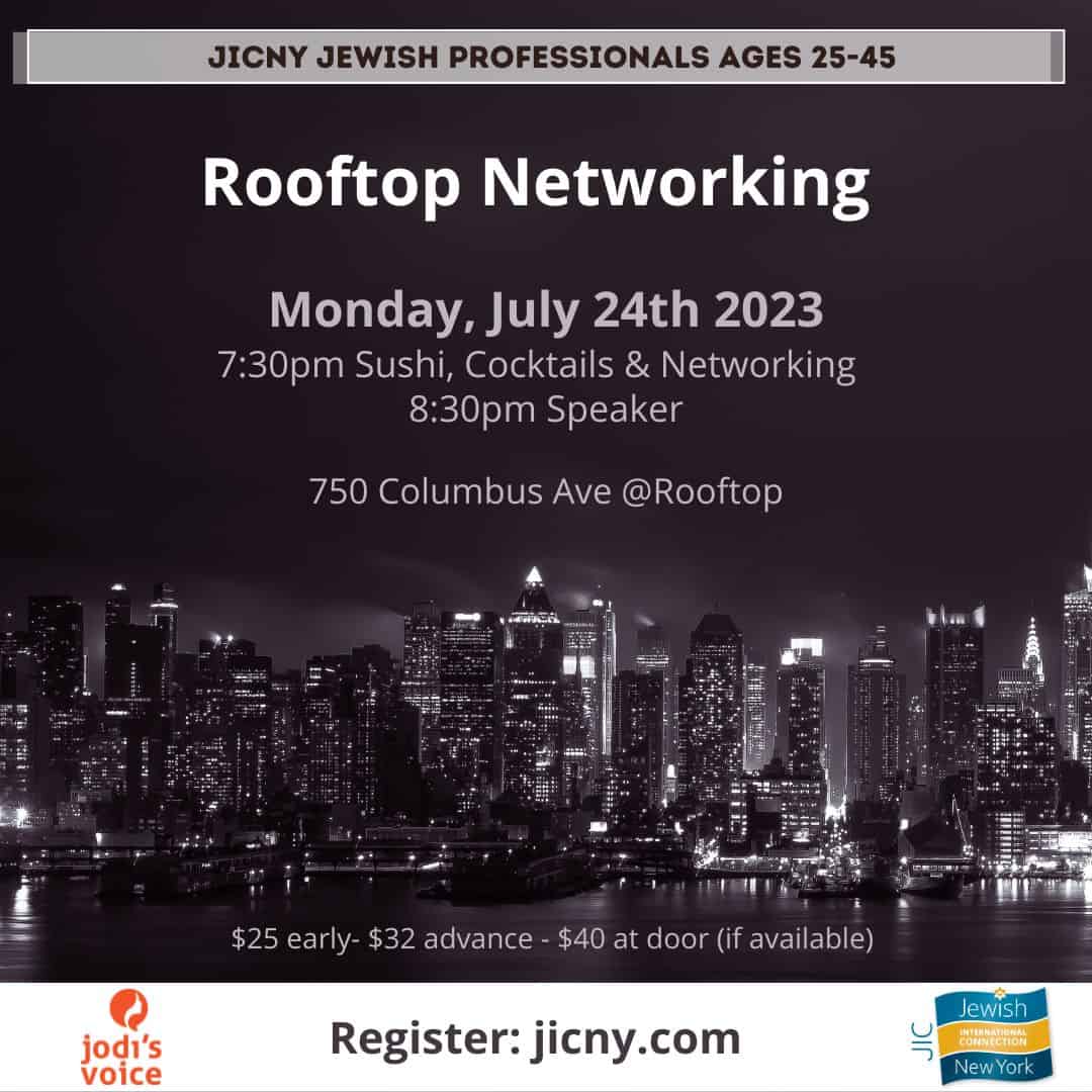 JICNY Big Apple Networking this month takes place Rooftop! (in case of rain, event will be moved inside)Networking & Learning from Successful Jewish Professionals. for ages 25-45Evening starts with informal networking, sushi & cocktails, followed by speaker: (speaker to be announced)DATE: Monday, July 24th, 2023SCHEDULE:7:30pm Sushi, Cocktails and Networking8:30pm Guest Speaker followed by a Q...