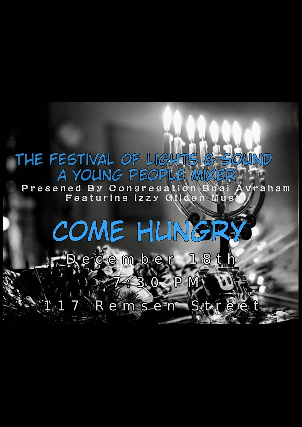Come and join the young professionals Rooftop Chanukah Party that is not to be missed! Featuring an on-site BBQ with choice meats and succulent chicken + all the delicious sides and veggies, and an epic bar featuring handcrafted cocktails and fine wines. Come meet new friends and hang out with old ones as we celebrate...
