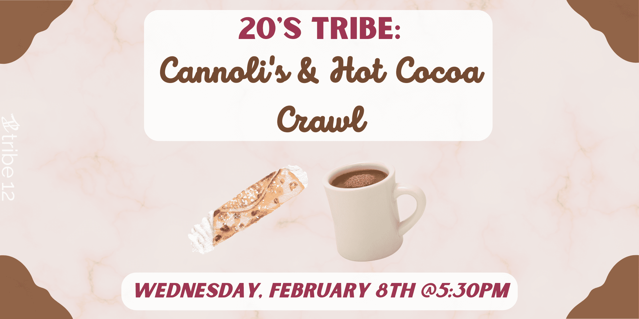 20’s Tribe: Cannoli’s and Hot Cocoa Crawl Feb 8 5:30 pm - 7:00 pm 20’s Tribe: Cannoli’s and Hot Cocoa Crawl