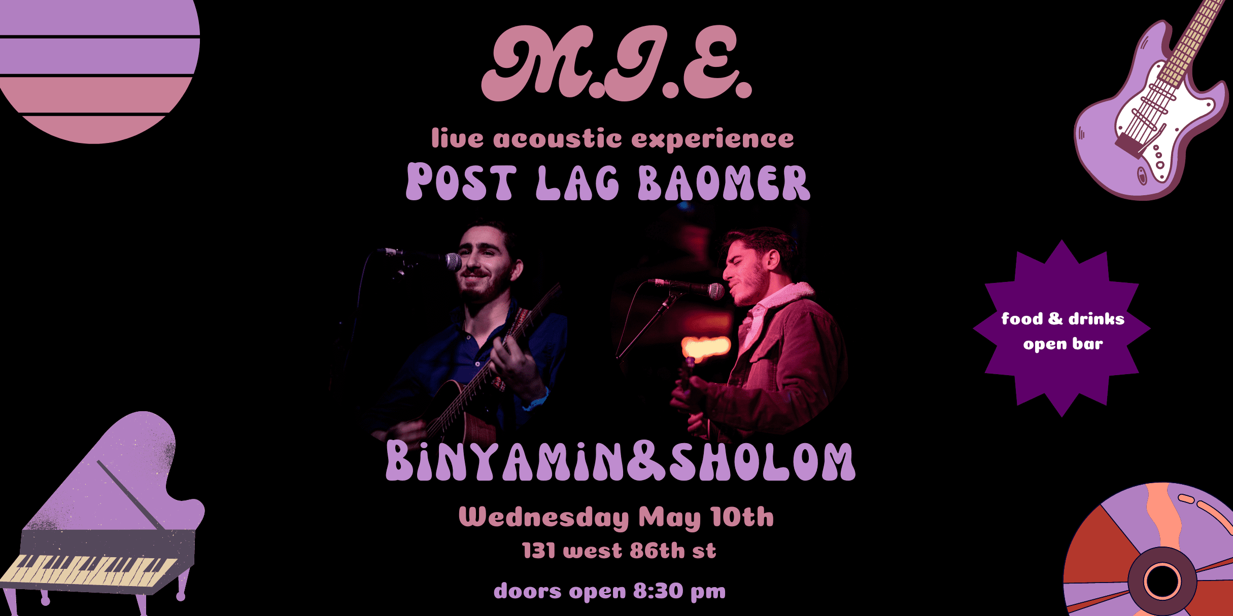 Lag Baomer Concert With Sholom Benstein & Binyamin | MJE YJPs 20s & 30s May 10 8:30 pm - 10:30 pm Lag Baomer Concert With Sholom Benstein & Binyamin | MJE YJPs 20s & 30s