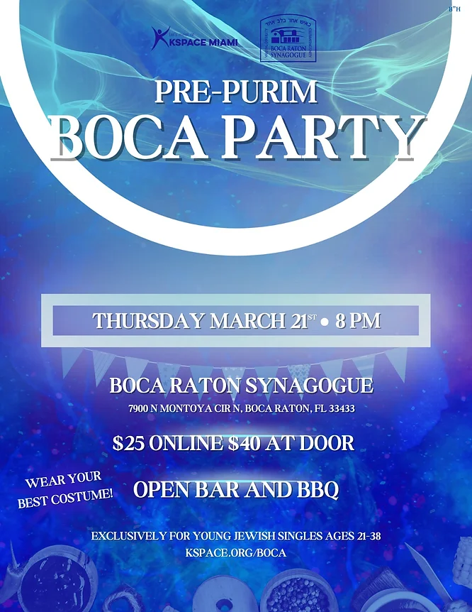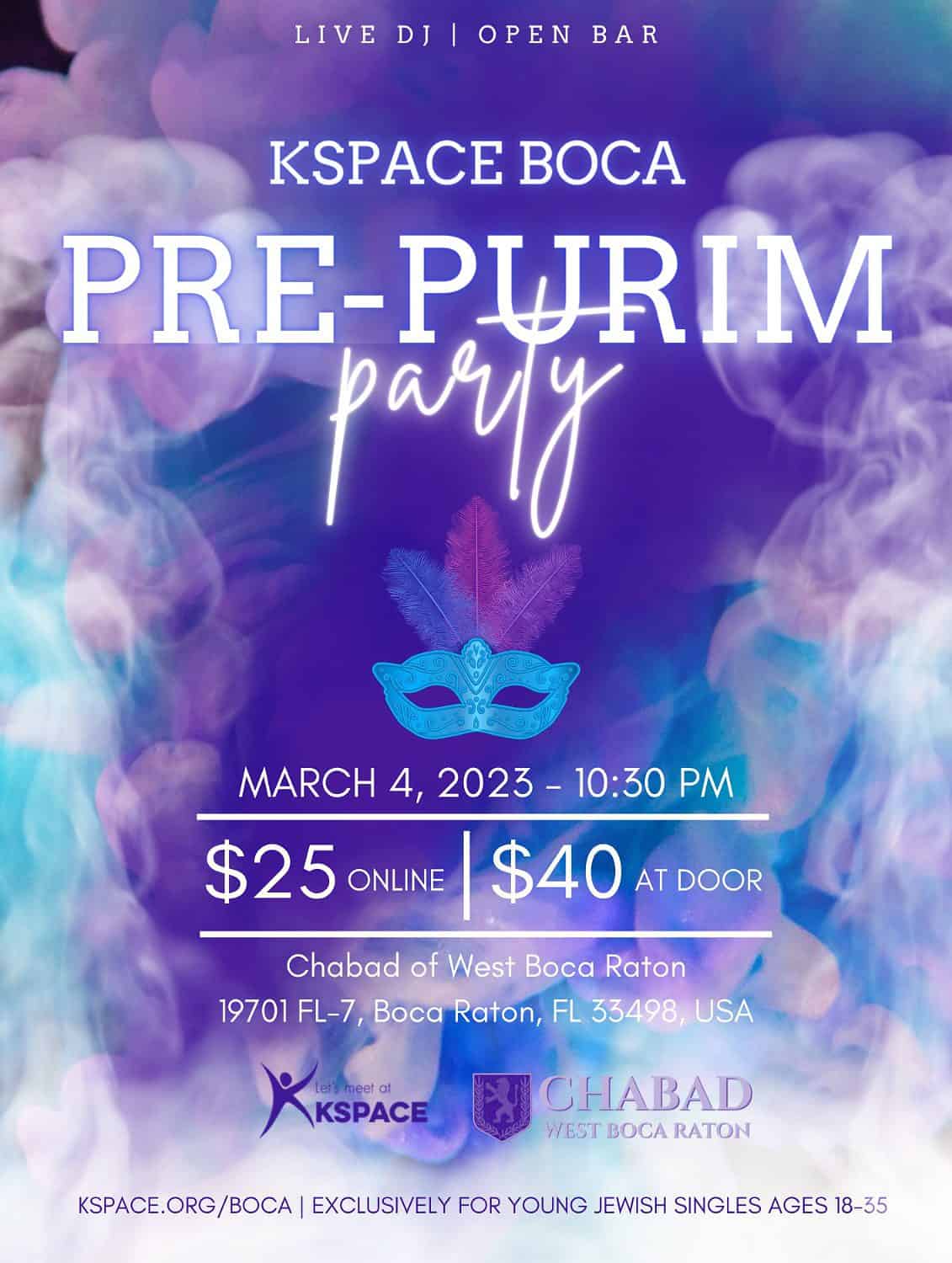 Join us for the KSPACE BOCA PRE-PURIM PARTY! Top location, open bar & a great ambiance that will make this…