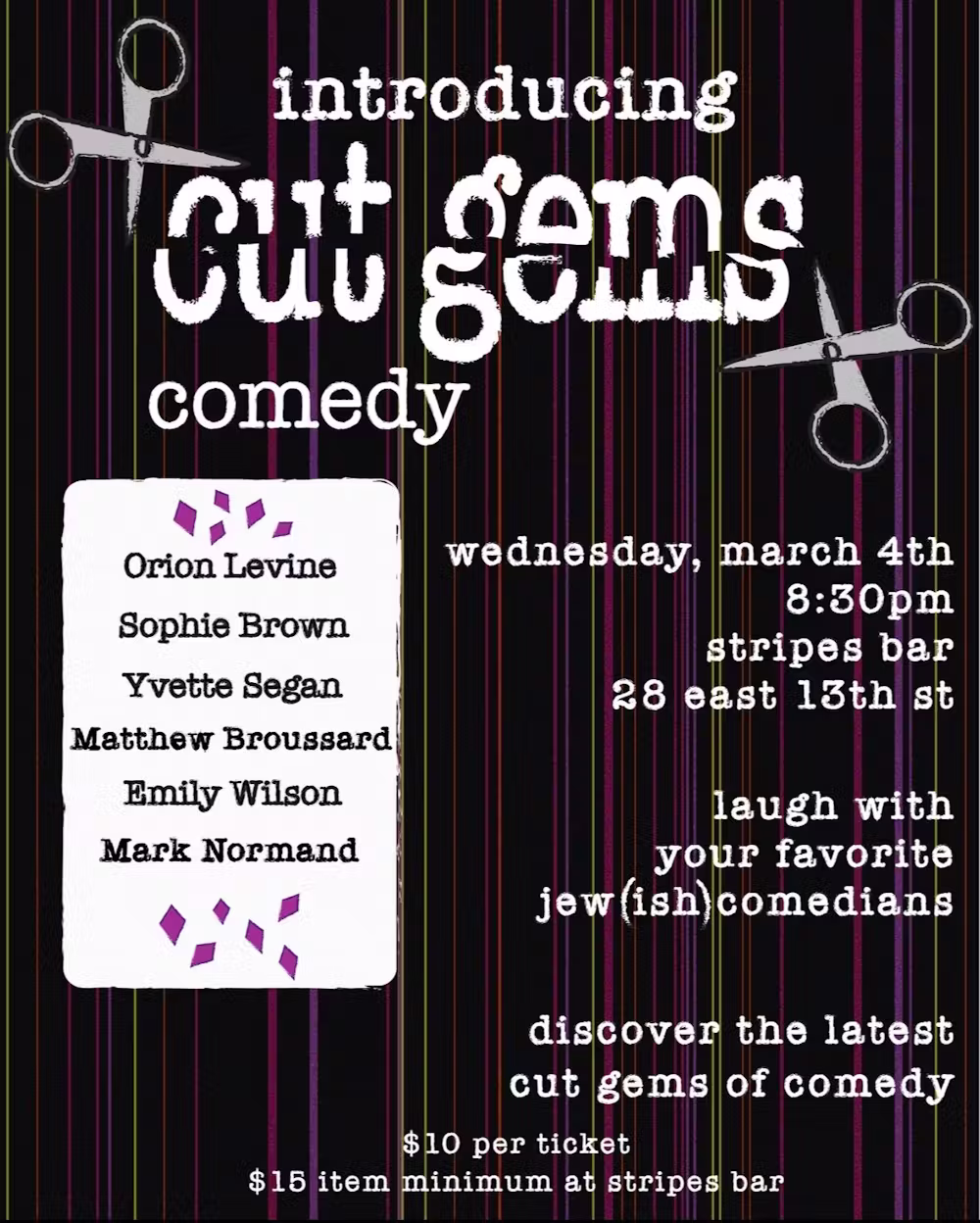 $10 at door RSVP to skip the line!! Embrace the Purim spirit and laugh with your friends at some of New York's finest comedians - all of whom have most likely had the pleasure of tasting a Kugel at least once in their lives✡️😌 Letting your weeknight go to waste is such a Shanda. Come...